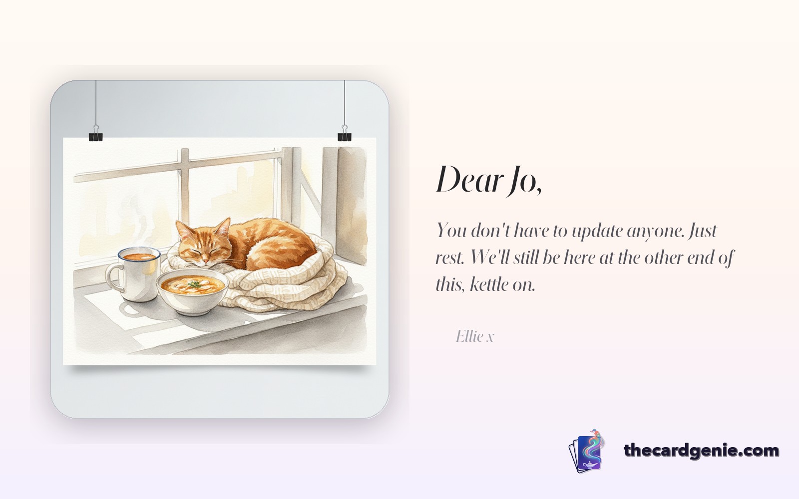 Get well soon cards are surprisingly hard to get right. The pastel supermarket rack says "Feel better soon!" in curly font, and the person unwrapping it on a hospital bed reads it for half a second before putting it on the tray with the others. A personalised AI card, built around something they actually care about, gets read twice.