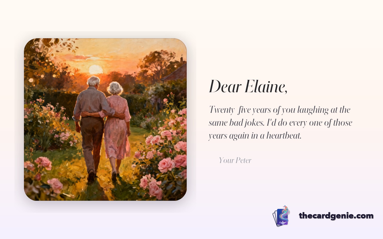 Anniversary cards get a lot harder after the fifth one. The first is easy - everything is still new. By the tenth, you've used "I love you more every year" six times already. By the twenty-fifth, the shop-bought card has actually run out of things to say. A personalised AI anniversary card, built around a specific memory or milestone, fixes that.
