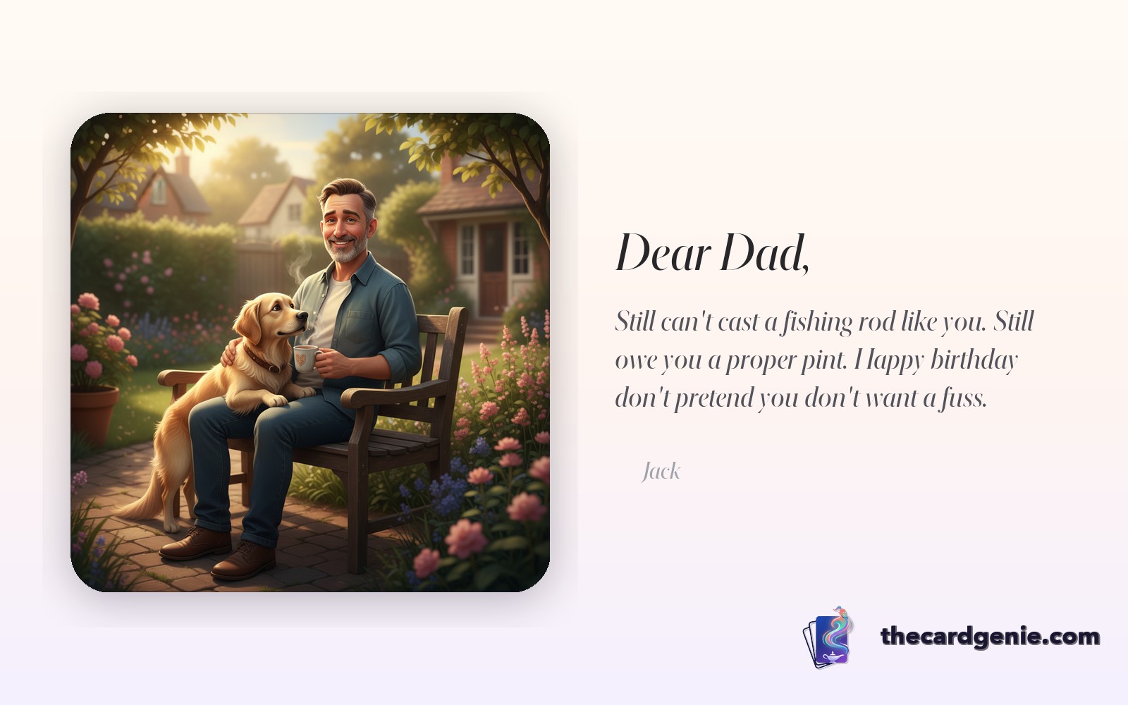 The shop-bought card is almost always too polite. It reaches for "world's best dad" and lands on a golf pun. Dads don't live in those sentences. They live in the specific things only you would know - the song he sings badly, the jumper he refuses to bin, the holiday photo he's weirdly proud of. A personalised AI birthday card lets you build a card around one of those things in under two minutes.
