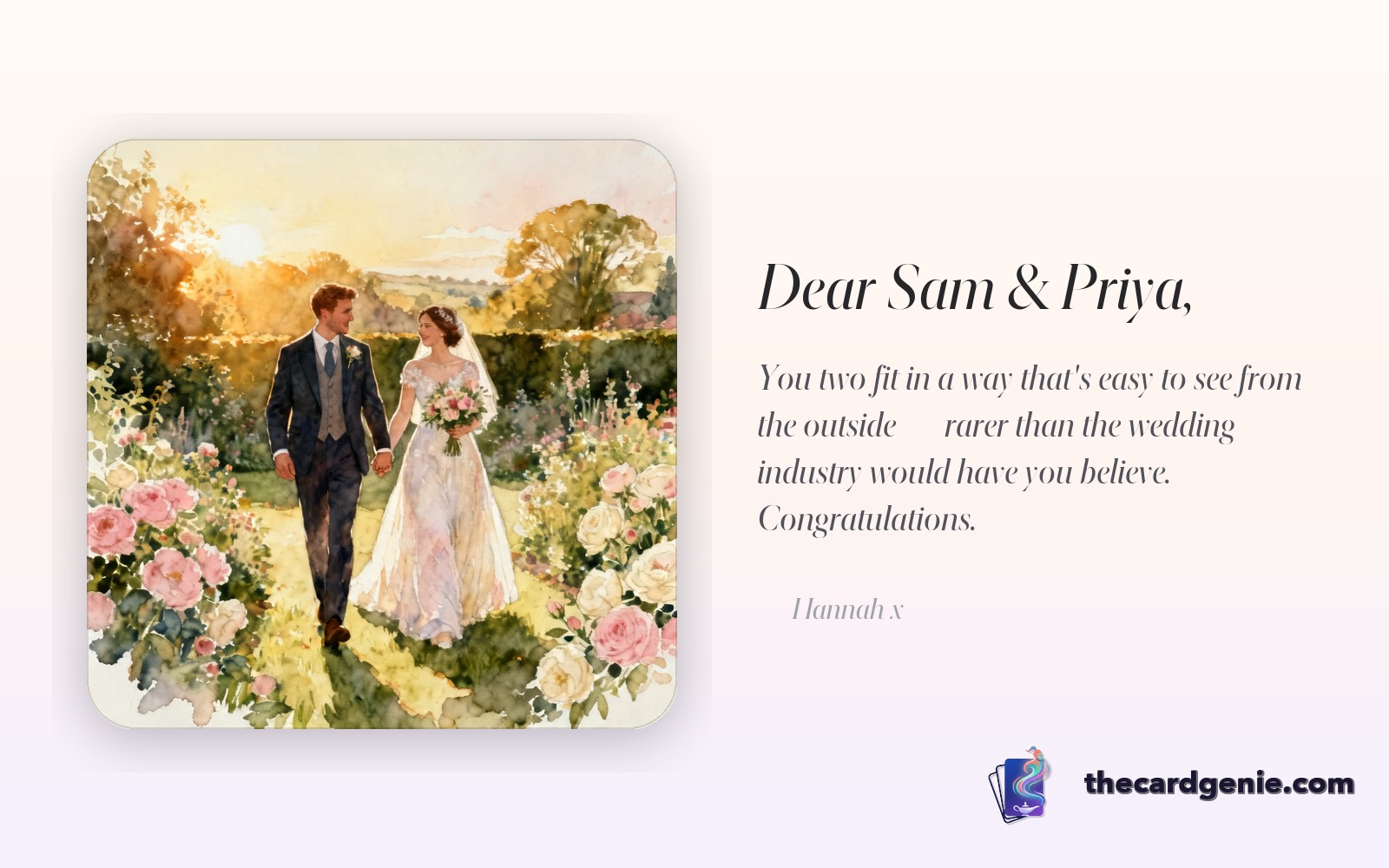 Every shop-bought wedding card says the same three things. Lifetime of love, many happy years, warmest wishes on your special day. The couple will read those sentences ninety times that weekend and remember none of them. The card they remember is the one that named something real about them - the way they met, the thing only you know, the holiday where you realised they were going to stick.